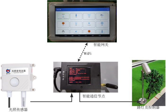 (1)路燈控制系統(tǒng):由智能通信節(jié)點及外圍驅(qū)動電路板、路燈、光照傳感器組成。智能通信節(jié)點實時采集光照度,通過無線通信方式傳輸至網(wǎng)關。結合網(wǎng)關應用程序,可以實現(xiàn)路燈開關控制、環(huán)境光照度定時采集,設置光照傳感器與路燈控制器的聯(lián)動策略,根據(jù)光照強度,自動控制路燈開關;同時將光照度數(shù)據(jù)、路燈開關狀態(tài)上傳到云平臺進行可視化展示,遠程路燈控制。