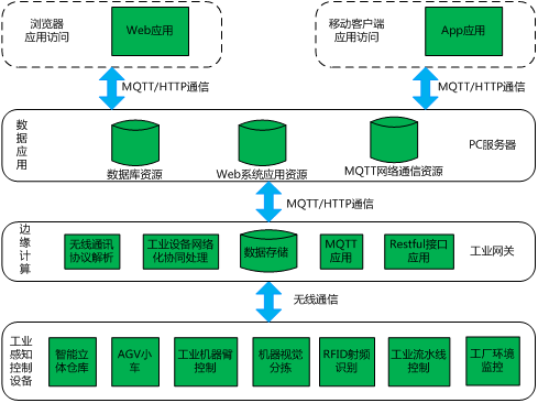 每個區(qū)都安裝有機械化生產裝置,通過通信節(jié)點實現(xiàn)嵌入式感知控制、無線自組網(wǎng),由網(wǎng)關上的生產線作業(yè)管理平臺進行本地控制,由可視化WEB平臺或移動端APP應用為用戶提供加工環(huán)節(jié)動態(tài)界面。系統(tǒng)采用B/S架構,其架構如圖所示。