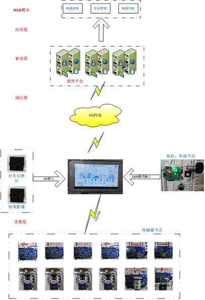 默認(rèn)運(yùn)行Android系統(tǒng),具有設(shè)備添加、ZigBee/CAN傳感器實(shí)時(shí)監(jiān)測(cè)、參數(shù)配置、行車(chē)記錄儀、倒車(chē)影像、地圖定位導(dǎo)航等功能項(xiàng)。系統(tǒng)設(shè)置主要設(shè)置CAN總線的波特率、zigbee協(xié)調(diào)器的串口號(hào)、服務(wù)器地址、傳感器上下限與執(zhí)行器的聯(lián)動(dòng)。設(shè)備添加主要用于向系統(tǒng)數(shù)據(jù)庫(kù)添加zigbee節(jié)點(diǎn)、CAN設(shè)備。行車(chē)記錄儀主要模擬車(chē)輛行駛過(guò)程中的視頻監(jiān)控。倒車(chē)影像主要模擬車(chē)輛在倒車(chē)時(shí)啟動(dòng)攝像頭進(jìn)行視頻監(jiān)控。系統(tǒng)支持導(dǎo)航定位,同時(shí)語(yǔ)音提醒道路狀況。當(dāng)?shù)缆钒l(fā)生擁堵時(shí),自動(dòng)發(fā)布。軟件內(nèi)置MQTT協(xié)議,可與WEB客戶(hù)端進(jìn)行即時(shí)通訊,實(shí)時(shí)顯示數(shù)據(jù)采樣信息和設(shè)備狀態(tài),同時(shí)通過(guò)webservice二次開(kāi)發(fā)接口將數(shù)據(jù)存入云服務(wù)器數(shù)據(jù)庫(kù),實(shí)現(xiàn)歷史數(shù)據(jù)存儲(chǔ)。