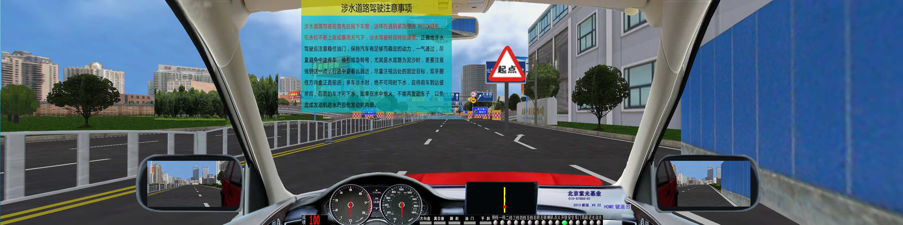 炫目道路:(朝九晚五的太陽)炫目會車,炫目駕駛鄉(xiāng)村道路等。泥濘道路:泥濘洼地道路駕駛(方向、制動、驅(qū)動有打滑滯后感)場景模型取鄉(xiāng)村道路,道路變?yōu)槟酀魻顟B(tài)。石子路面:汽車在其上面行駛,遇到剎車時(shí)剎不住車,還可汽車還在繼續(xù)滑動,有時(shí)還會斜向滑行,極難控制感,汽車在石子路面里滑動。涉水道路:涉水駕駛汽車有水流沖力對車輛的前進(jìn)阻力感光及側(cè)滑感,輪胎與水下的路壓力減小,驅(qū)動力受到限制,使行駛受阻感覺。專項(xiàng)訓(xùn)練:要附合交通部要求。系統(tǒng)評分:每次駕駛結(jié)束,系統(tǒng)自動評分。山區(qū)到路:突出坡多、彎多、凹凸路面、駕駛環(huán)境復(fù)雜、有側(cè)風(fēng)、有陡坡長坡、溜坡、側(cè)滑(有語音提示)。鄉(xiāng)村道路:含鐵道路口;加油站,公交車站、單行道、農(nóng)田道口等;城市道路:含公交站臺,高架立交橋、公交專用道、十字路口、丁字路口、環(huán)島、隧道、單行道、雙黃線、加油站、商場百貨門口斑馬線天橋,學(xué)校門口及紅綠燈,行人、非機(jī)動車亂穿馬路及非機(jī)動車等。高速公路:包括收費(fèi)站(入、停、出、)服務(wù)區(qū)、緊急帶、匝道行駛、超車道、行車道、隧道、立交橋、交通標(biāo)牌標(biāo)線。危險(xiǎn)場景:視線不清的交通情況下,超車后突然切入他人道引起被超車輛緊急制動、自行車、行人突然橫穿馬路,路面維修,障礙物繞行等 危險(xiǎn)場景、專項(xiàng)駕駛:危險(xiǎn)道路、眩目道路、爆胎體驗(yàn)、緊急避讓、趣味駕駛等駕駛科目。 |