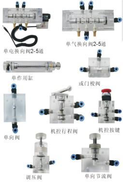 8、配有控制模塊:電源模塊,PLC控制模塊,繼電器控制模塊,控制按鈕模塊,氣動元件獨(dú)立模塊等。