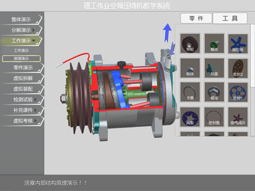 空調(diào)壓縮機(jī)虛擬仿真教學(xué)系統(tǒng) 選用空調(diào)壓縮機(jī)的實物進(jìn)行1:1的建模,從各大院校對汽車空調(diào)壓縮機(jī)的教學(xué)要求出發(fā),采用三維仿真教學(xué)風(fēng)格,空調(diào)壓縮機(jī)可以在虛擬仿真...