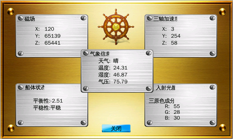 該系統(tǒng)表征了傳感器在航海導(dǎo)航領(lǐng)域的應(yīng)用,界面顯示海上航行船舶的狀態(tài)信息及所處周?chē)h(huán)境、氣象信息等。
