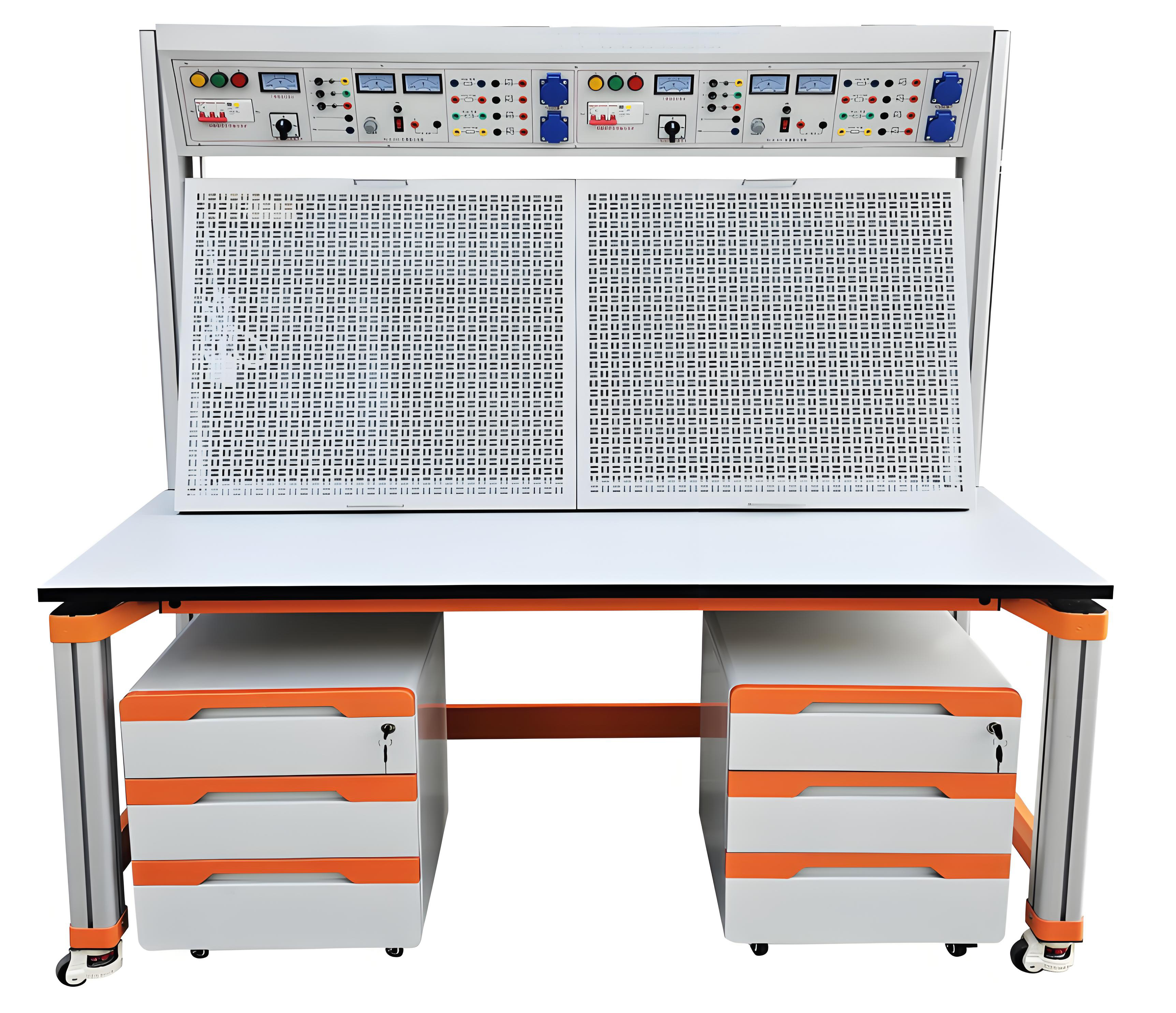 1、學(xué)生實(shí)訓(xùn)操作桌12張,一桌二座,桌面配備一塊膠皮板保護(hù)桌面,桌體下部配備元件儲(chǔ)存柜,放置實(shí)訓(xùn)考核元器件,使用、保管方便,桌體中部左右設(shè)有兩個(gè)抽屜,放置常用工具等。