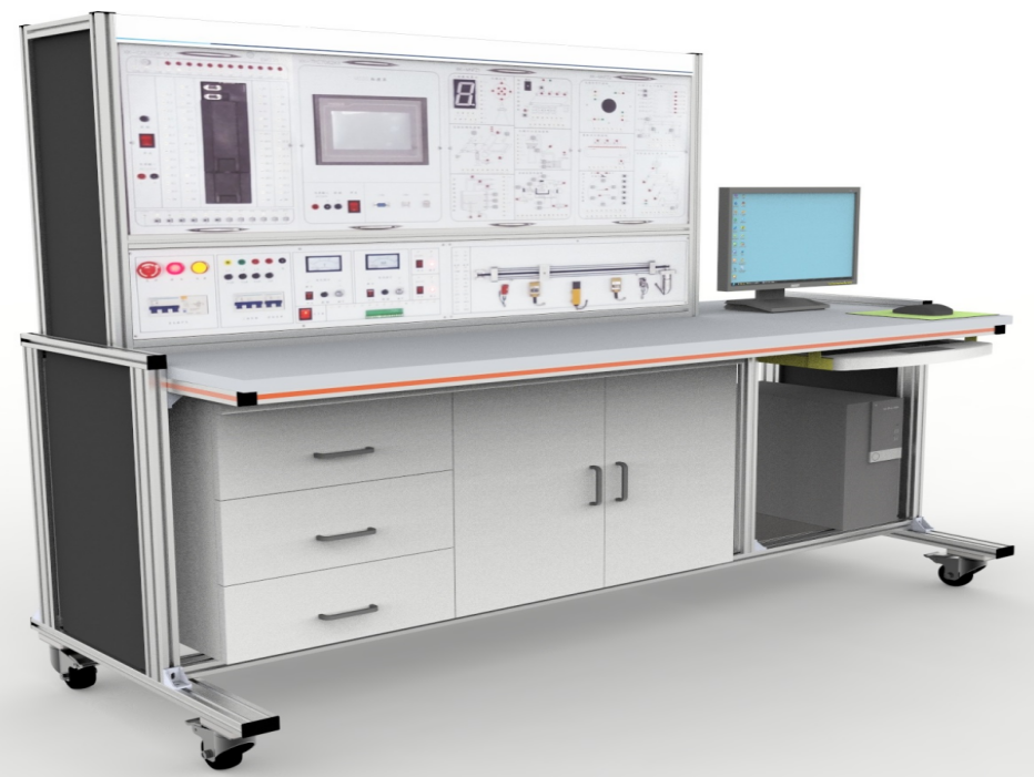2、臺架構(gòu)成:實訓(xùn)臺采用工業(yè)鋁型材加工。桌面下面放置儲物柜,左側(cè)有3層抽屜,用于存放工具以及實訓(xùn)資料,右側(cè)為雙拉門式設(shè)計,可以放置實訓(xùn)掛箱。底部裝有四個帶鎖止功能的萬向輪。柜體后下側(cè)留有電源輸入線。預(yù)留計算機(jī)放置位置。