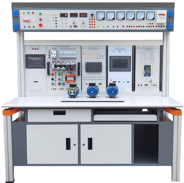 由實(shí)訓(xùn)屏、實(shí)訓(xùn)電氣元件(繼電器、PLC、電機(jī)等)、實(shí)訓(xùn)桌、實(shí)訓(xùn)導(dǎo)線、常用電工工具、PLC編程電纜、教學(xué)課件等組成。