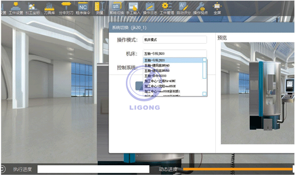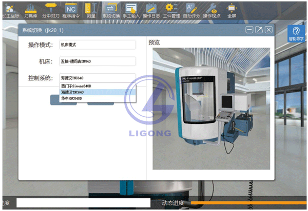LGS-SX02型 數(shù)控車銑加工一體化創(chuàng)新仿真實(shí)訓(xùn)平臺(tái)的數(shù)字孿生機(jī)床仿真部分,操作極為簡(jiǎn)單,放大、縮小、旋轉(zhuǎn)、平移、觸控等等。學(xué)生無需特殊訓(xùn)練,即可直接上手使用??芍С职ㄈS的數(shù)控機(jī)床如法蘭克、西門子、華中、廣數(shù),以及多軸的數(shù)控機(jī)床如西門子840D、華中848D、海德漢TNC640等主流操作系統(tǒng),支持加工中心、車床、斜床等數(shù)控機(jī)床設(shè)備,目前數(shù)控I8多軸智能訓(xùn)練機(jī)包含了11套不同類型數(shù)控系統(tǒng)設(shè)備。