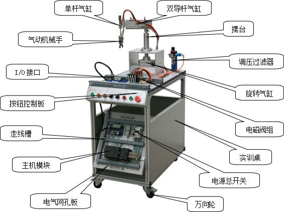 該系統(tǒng)上使用了大量的氣動元件,包括多種電控氣動閥、多種氣動缸、氣動夾爪、真空吸盤、真空發(fā)生器、過濾減速閥等。在學(xué)習(xí)這些氣動元件時,不但可以單獨學(xué)習(xí)每一種分離元件,而且還可以在學(xué)習(xí)時了解各種氣動元件之間,以及氣動元件與其它元件之間,如何配合起來并協(xié)調(diào)進行工作的。