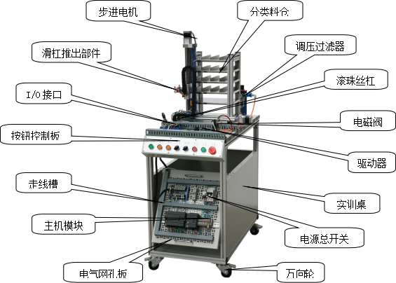 由滾珠絲杠、滑桿推出部件、分類料倉、步進電機、步進驅(qū)動器、電感傳感器、開關(guān)電源、可編程序控制器、按鈕、I/O接口板、通訊接口板、電氣網(wǎng)孔板、多種類型電磁閥及氣缸組成,主要完成按工件類型分類,將工件推入料倉。