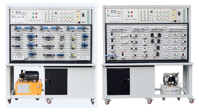 該實訓裝備覆蓋了氣壓傳動、液壓傳動、傳動繼電器控制、PLC自動控制、傳感器應用技術等多個技術領域 。是氣壓傳動技術、液壓傳動技術和各種現(xiàn)代控制技術的組合體。加上該實訓采用雙面工作臺結構設計,一個實訓裝備可供兩組學生同時進行各自不同的實訓,大大的提高了實訓設備的使用效率,并有效的利用了實訓室空間。