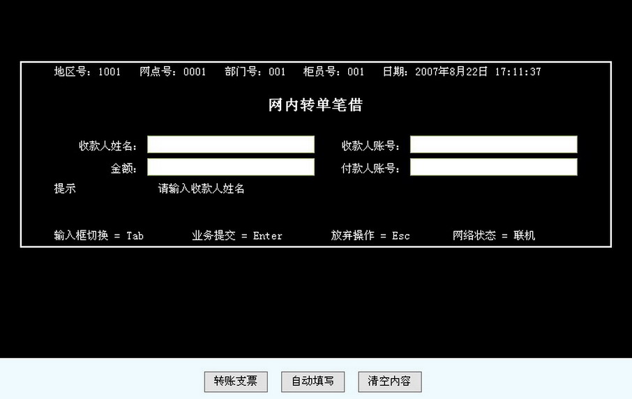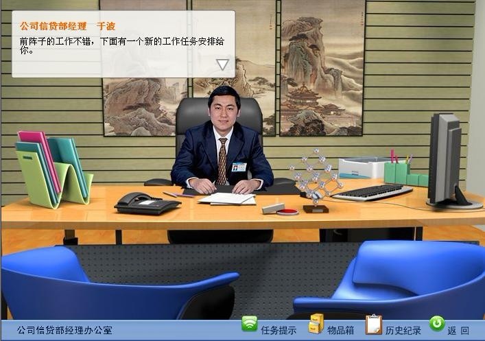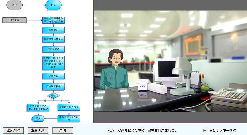 學(xué)生在經(jīng)過(guò)基礎(chǔ)的實(shí)務(wù)課程學(xué)習(xí)后,將被置于一個(gè)完全仿真的現(xiàn)代商業(yè)銀行的工作環(huán)境中,面對(duì)銀行每日的工作開(kāi)始進(jìn)行模擬實(shí)操。學(xué)生們將會(huì)面對(duì)虛擬的客戶提出的各種要求來(lái)進(jìn)行相應(yīng)的處理。對(duì)于學(xué)生來(lái)講,實(shí)操過(guò)程中的所有操作都是自由的,他們需要通過(guò)完全自主的思考來(lái)判斷下一步的操作。譬如客戶提出的支票轉(zhuǎn)帳請(qǐng)求是否受理?如果不受理理由是什么?(譬如涉及支票的鑒別、簽章的鑒別等)接受以后如何操作?同時(shí)模擬系統(tǒng)根據(jù)內(nèi)置的業(yè)務(wù)邏輯自動(dòng)判斷學(xué)生操作的正確性,對(duì)其業(yè)務(wù)能力進(jìn)行實(shí)時(shí)的評(píng)價(jià)和記錄,并且將結(jié)果及時(shí)反饋給學(xué)生。通過(guò)每一步操作的自主思考和系統(tǒng)不斷的提示加強(qiáng)學(xué)生對(duì)于業(yè)務(wù)處理的理解,幫助其提高業(yè)務(wù)操作的熟練程度,并且培養(yǎng)其判斷分析能力。實(shí)操訓(xùn)練的內(nèi)容完全參照日常銀行業(yè)務(wù)操作所涉及的范圍,同時(shí)也可以根據(jù)實(shí)驗(yàn)課程主題的要求進(jìn)行具體的靈活配置。