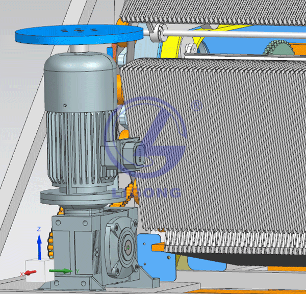 由交流電機(jī)、專用減速器、制動器、手動盤車和傳動齒輪等組成。