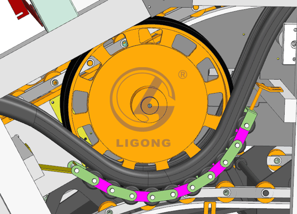 由扶手齒輪、扶手摩擦輪、張緊輪、托輥輪、壓輥輪、托帶鏈、回轉(zhuǎn)鏈行扶手導(dǎo)軌組成扶手帶動力系統(tǒng)。