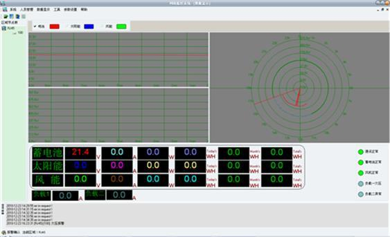 顯示內(nèi)容:蓄電池電壓、風機電壓、光伏電壓、風機電流、光伏電流、風機功率、光伏功率,能量模擬圖,當前風速(米/秒),當前風向(度),當前風力資源平估。