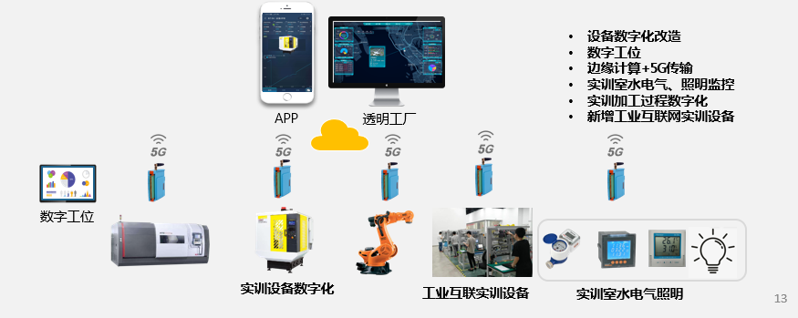 該平臺(tái)可對(duì)原有實(shí)訓(xùn)室生產(chǎn)線進(jìn)行數(shù)字化改造,把傳統(tǒng)設(shè)備升級(jí)為數(shù)字化設(shè)備,對(duì)數(shù)控機(jī)床、機(jī)器人、PLC和自動(dòng)化生產(chǎn)線等實(shí)訓(xùn)室進(jìn)行智能化改造。利用傳感器、邊緣計(jì)算、大數(shù)據(jù)和工業(yè)互聯(lián)網(wǎng)技術(shù)改造實(shí)訓(xùn)室的實(shí)訓(xùn)設(shè)備和教學(xué)基礎(chǔ)設(shè)施,實(shí)現(xiàn)遠(yuǎn)程監(jiān)視、遠(yuǎn)程控制、遠(yuǎn)程維護(hù)、多設(shè)備協(xié)同、生產(chǎn)管理等功能。在每臺(tái)設(shè)備上加裝一套數(shù)字化改造套裝,有邊緣計(jì)算網(wǎng)關(guān)和數(shù)字工位量部分組成。