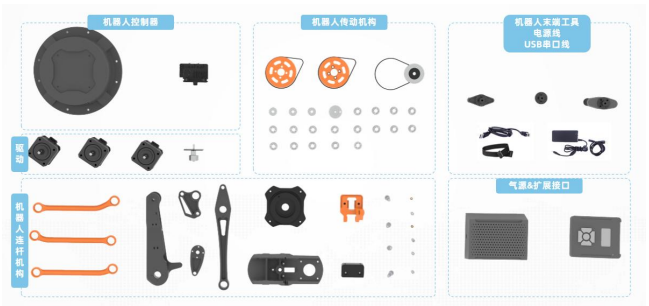 實驗箱包含由機器人控制器、機器人驅動電機、機械限位開關、機器人結構件及機器人末端工具。