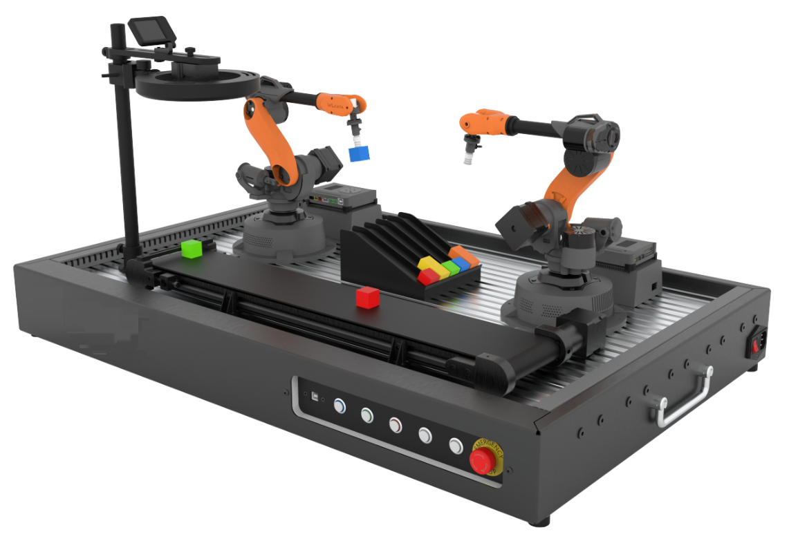 1、功能描述:產(chǎn)線由機(jī)械臂、傳送帶套件及AI視覺套件組成,沙盤模擬視覺系統(tǒng)與機(jī)械臂在工業(yè)自動(dòng)化中的配合協(xié)作。本產(chǎn)線可自動(dòng)化循環(huán)運(yùn)行,運(yùn)行時(shí)木塊滑臺(tái)上的傳感器判斷當(dāng)前位置是否有木塊,并控制機(jī)械臂隨機(jī)吸取一個(gè)顏色的木塊放置于傳送帶上,傳送帶將木塊運(yùn)送至視覺模塊下方,視覺模塊分析木塊的顏色及位置信息并控制左側(cè)的機(jī)械臂將木塊放置于滑臺(tái)的對應(yīng)位置,此過程循環(huán)往復(fù);