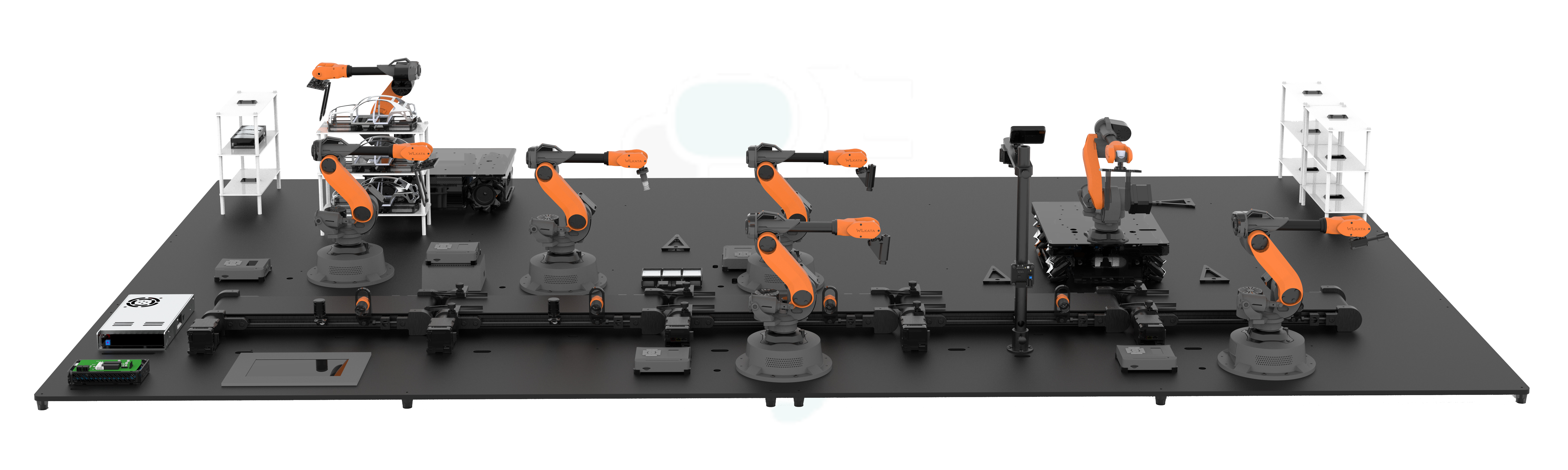 桌面六軸機器人*5;復(fù)合移動機器人*2;AI視覺套件*1;傳送單元*5;人機交互屏*1;配件包*1